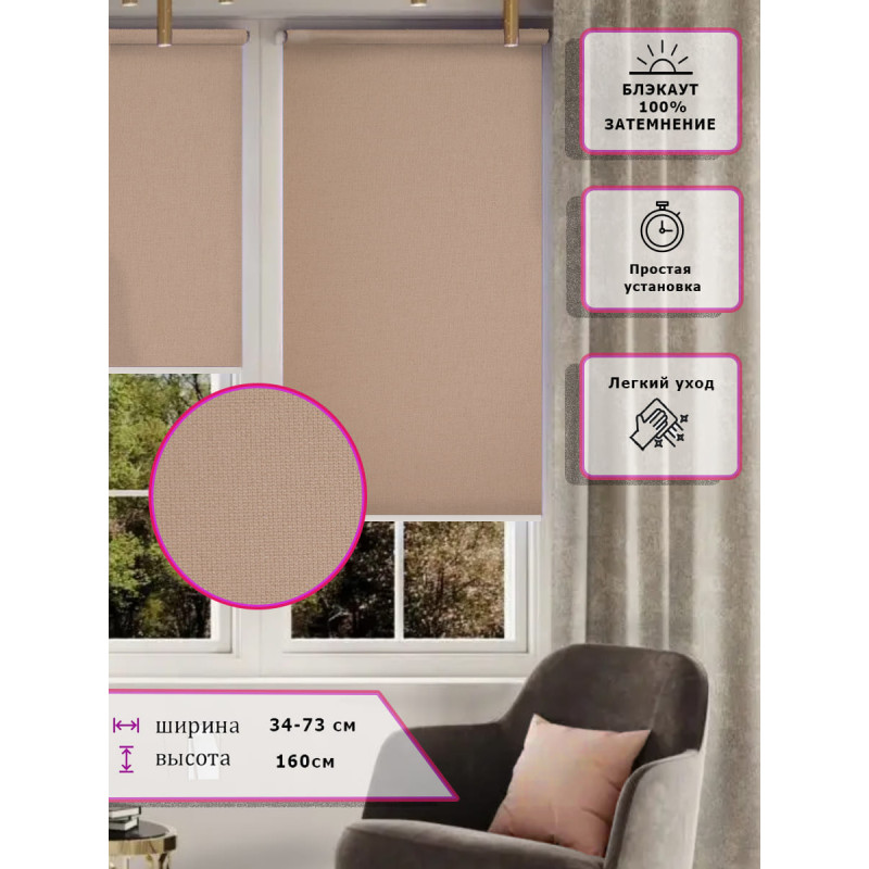 Ткань обладает отличной цветоустойчивостью 100 затемнение со специальным покрытием защищающим помещение от нагрева.