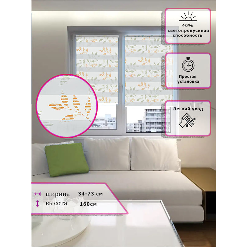 Ролл-шторы День-ночь Зебра Узор листья оранжевый/зеленый Арт.4362-08 стиль и функциональность