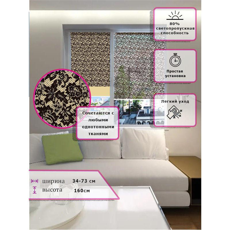 Штора выполнена из прочного полиэстера с обработкой специальным составом отталкивающим пыль.