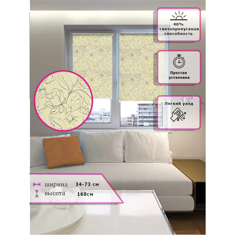 Штора выполнена из прочного полиэстера с обработкой специальным составом отталкивающим пыль.