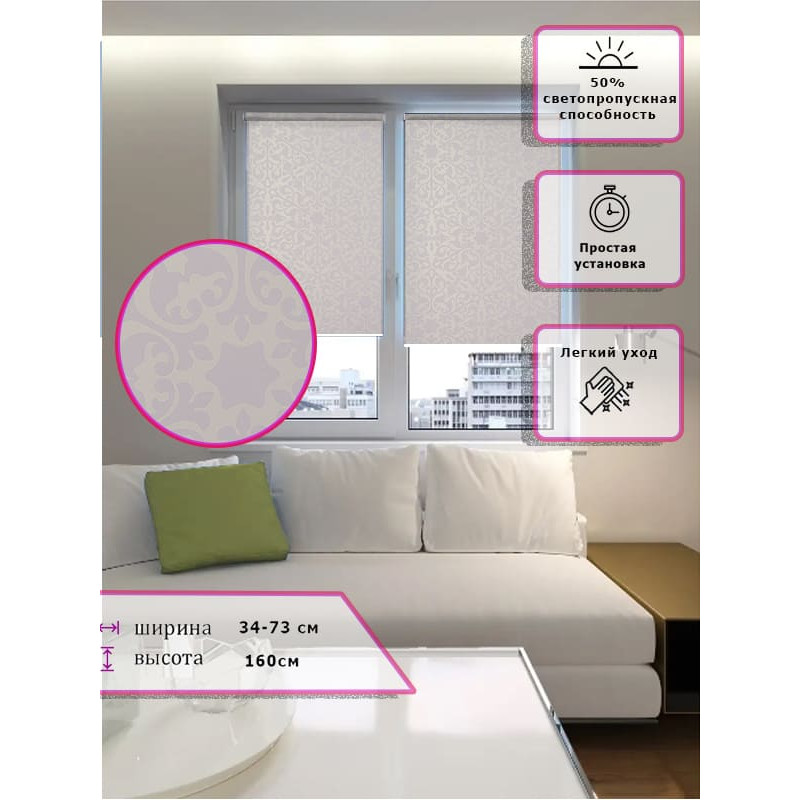 Штора выполнена из прочного полиэстера с обработкой специальным составом отталкивающим пыль.