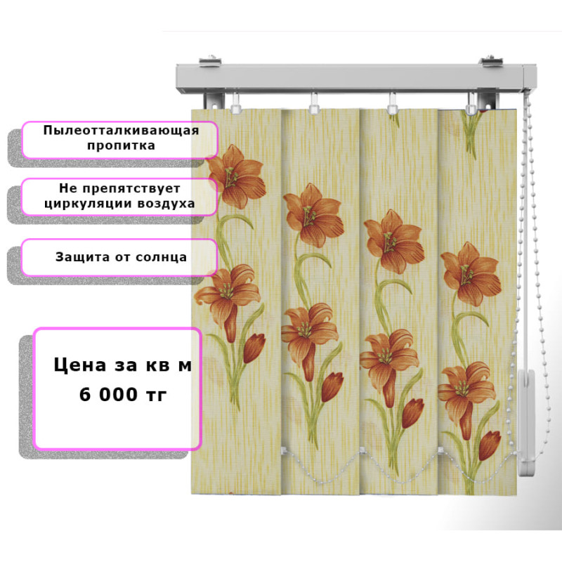 Вертикальные жалюзи (Арт. 1713) Цветы Лимонный — практичное и стильное решение для оформления оконных проёмов. Они отлично защищают помещение от солнечных лучей, создают комфортную атмосферу и позволяют легко регулировать уровень освещения. Благодаря современным материалам и широкому выбору расцветок жалюзи гармонично впишутся в любой интерьер — от классического до современного.