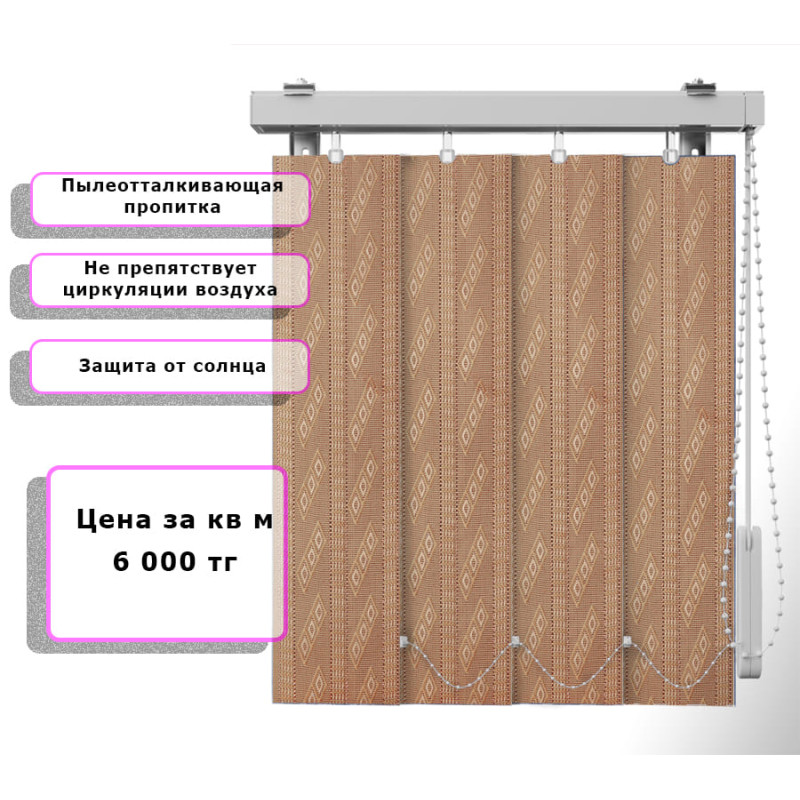Вертикальные жалюзи (Арт. 4024) Узор Коричневый - подходят для жилых, офисных и общественных помещений. Уход прост: достаточно протирать ламели влажной салфеткой или использовать мягкую щётку. При необходимости возможна деликатная ручная стирка.