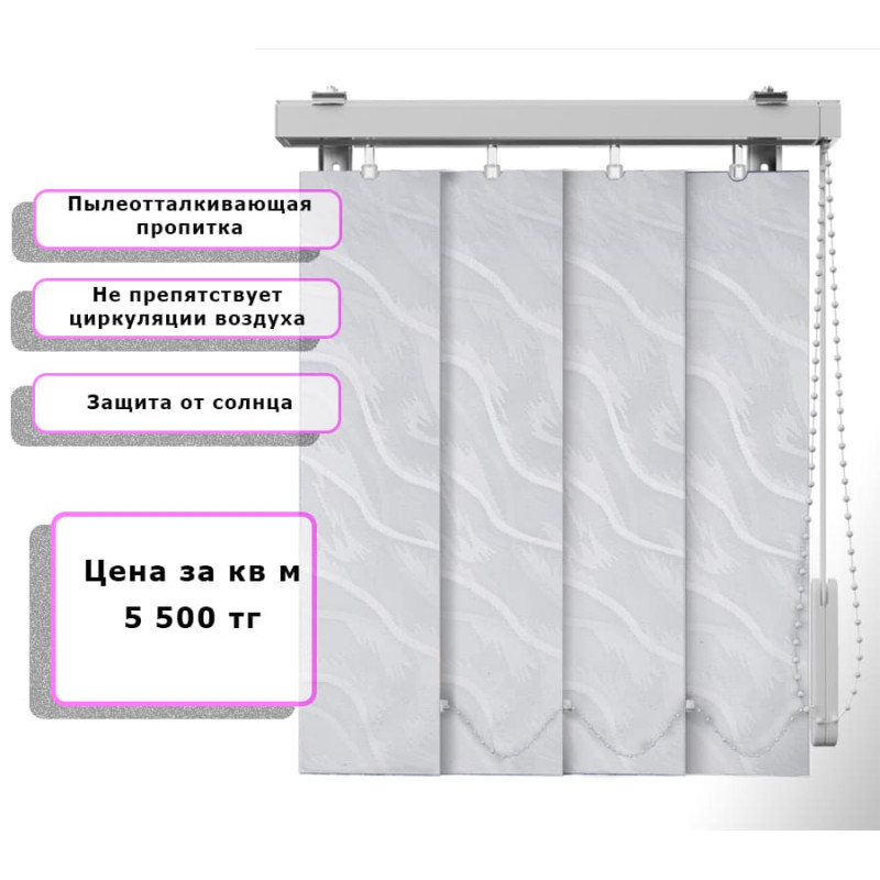 Вертикальные жалюзи Ирис (Арт. 5001) Белый — практичное и стильное решение для оформления оконных проёмов. Они отлично защищают помещение от солнечных лучей, создают комфортную атмосферу и позволяют легко регулировать уровень освещения. Благодаря современным материалам и широкому выбору расцветок жалюзи гармонично впишутся в любой интерьер — от классического до современного.