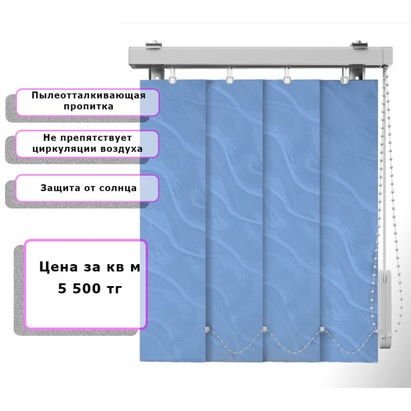 Вертикальные жалюзи Ирис (Арт. 5005) Серо голубой - подходят для жилых, офисных и общественных помещений. Уход прост: достаточно протирать ламели влажной салфеткой или использовать мягкую щётку. При необходимости возможна деликатная ручная стирка.