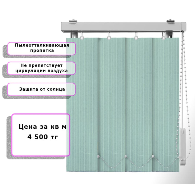 Вертикальные жалюзи Лайн (Арт. 2306) Светлый бирюзовый - подходят для жилых, офисных и общественных помещений. Уход прост: достаточно протирать ламели влажной салфеткой или использовать мягкую щётку. При необходимости возможна деликатная ручная стирка.