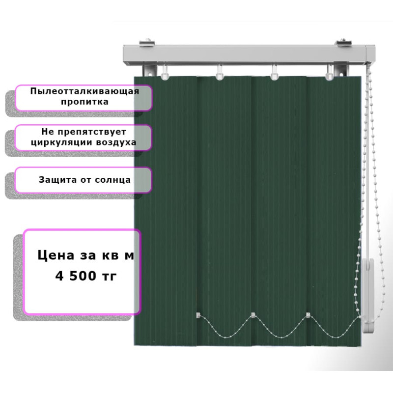 Вертикальные жалюзи Лайн (Арт. 2340) Зеленый - подходят для жилых, офисных и общественных помещений. Уход прост: достаточно протирать ламели влажной салфеткой или использовать мягкую щётку. При необходимости возможна деликатная ручная стирка.