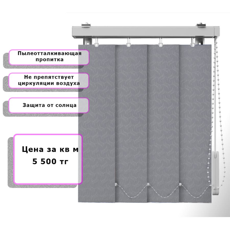 Вертикальные жалюзи Ниагара (Арт. 4834) Серый — практичное и стильное решение для оформления оконных проёмов. Они отлично защищают помещение от солнечных лучей, создают комфортную атмосферу и позволяют легко регулировать уровень освещения. Благодаря современным материалам и широкому выбору расцветок жалюзи гармонично впишутся в любой интерьер — от классического до современного.