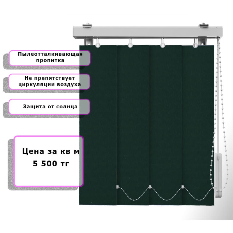 Вертикальные жалюзи Ниагара (Арт. 4840) Зеленый — практичное и стильное решение для оформления оконных проёмов. Они отлично защищают помещение от солнечных лучей, создают комфортную атмосферу и позволяют легко регулировать уровень освещения. Благодаря современным материалам и широкому выбору расцветок жалюзи гармонично впишутся в любой интерьер — от классического до современного.
