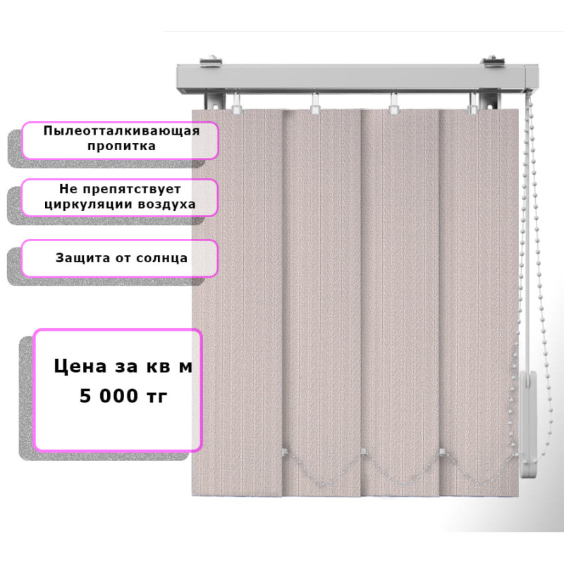 Вертикальные жалюзи Ёлочка (Арт. 2103) Персиковый — практичное и стильное решение для оформления оконных проёмов. Они отлично защищают помещение от солнечных лучей, создают комфортную атмосферу и позволяют легко регулировать уровень освещения. Благодаря современным материалам и широкому выбору расцветок жалюзи гармонично впишутся в любой интерьер — от классического до современного.