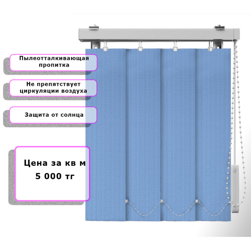 Вертикальные жалюзи Ёлочка (Арт. 2109) Голубой - подходят для жилых, офисных и общественных помещений. Уход прост: достаточно протирать ламели влажной салфеткой или использовать мягкую щётку. При необходимости возможна деликатная ручная стирка.